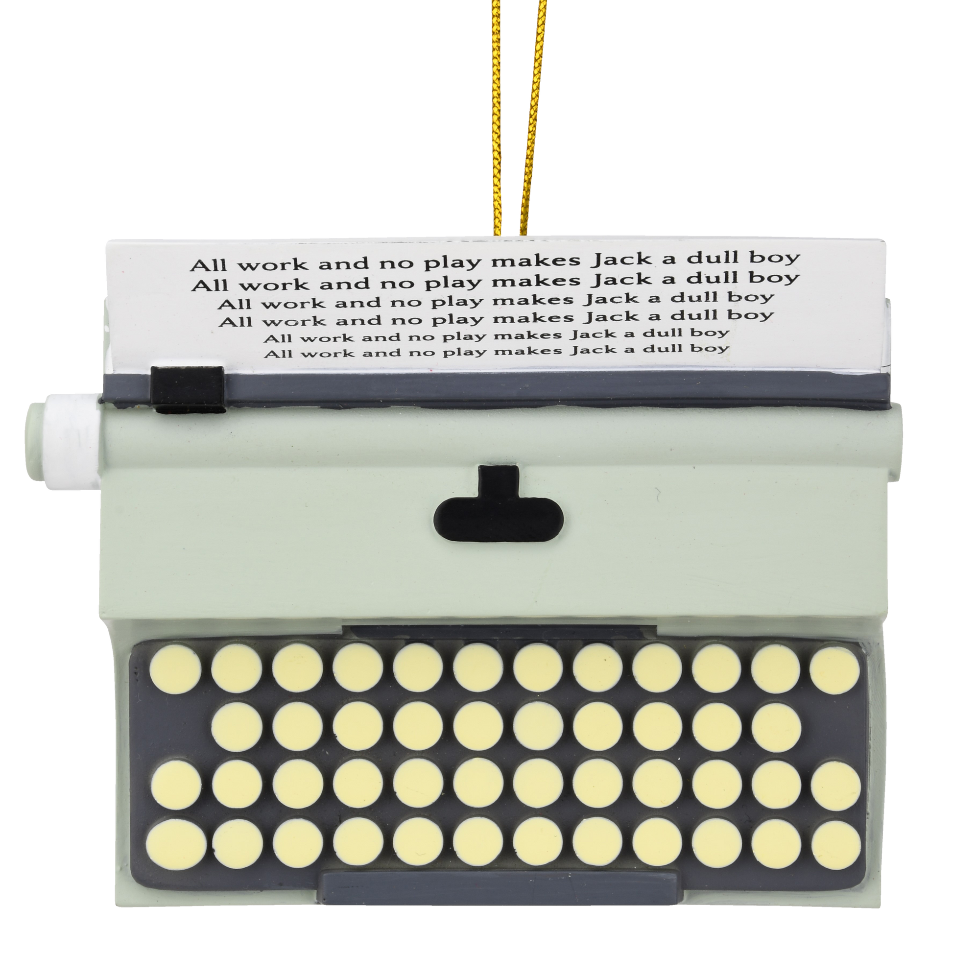 "All Work and No Play....." This unique ornament blends spooky horror vibes with festive holiday charm! Featuring a vintage typewriter with the chilling phrase “All Work and No Play…” it’s the perfect mix of Halloween eeriness and Christmas cheer. With its fun nostalgic design it is a must-have for collectors of creepy, kooky Christmas decor!