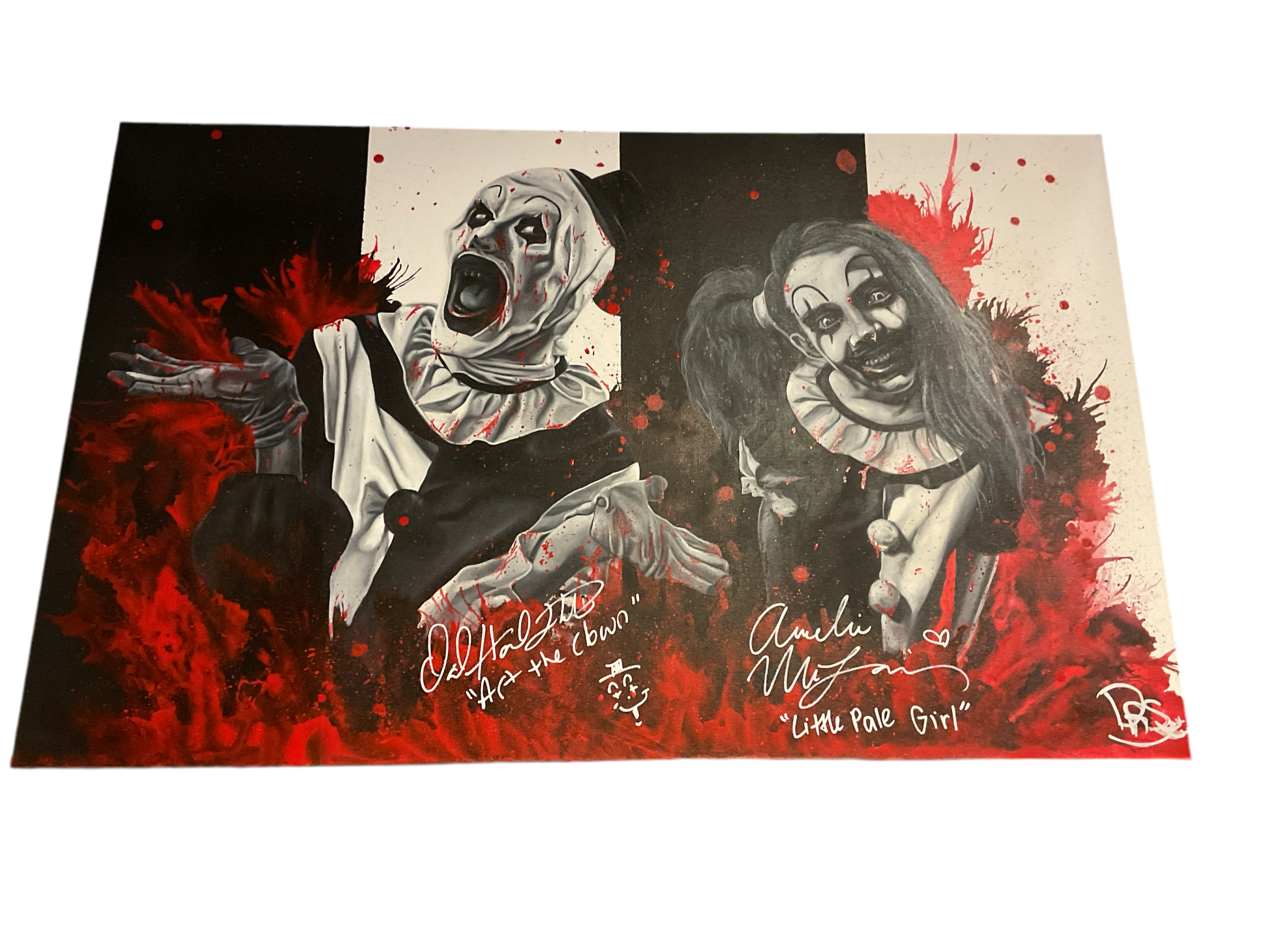 This one of a kind Terrifier 2 painting by Derrick Smith has been autographed by David Howard Thornton & Amelie McLain at the Steel City Con. Comes with Photo Certification.