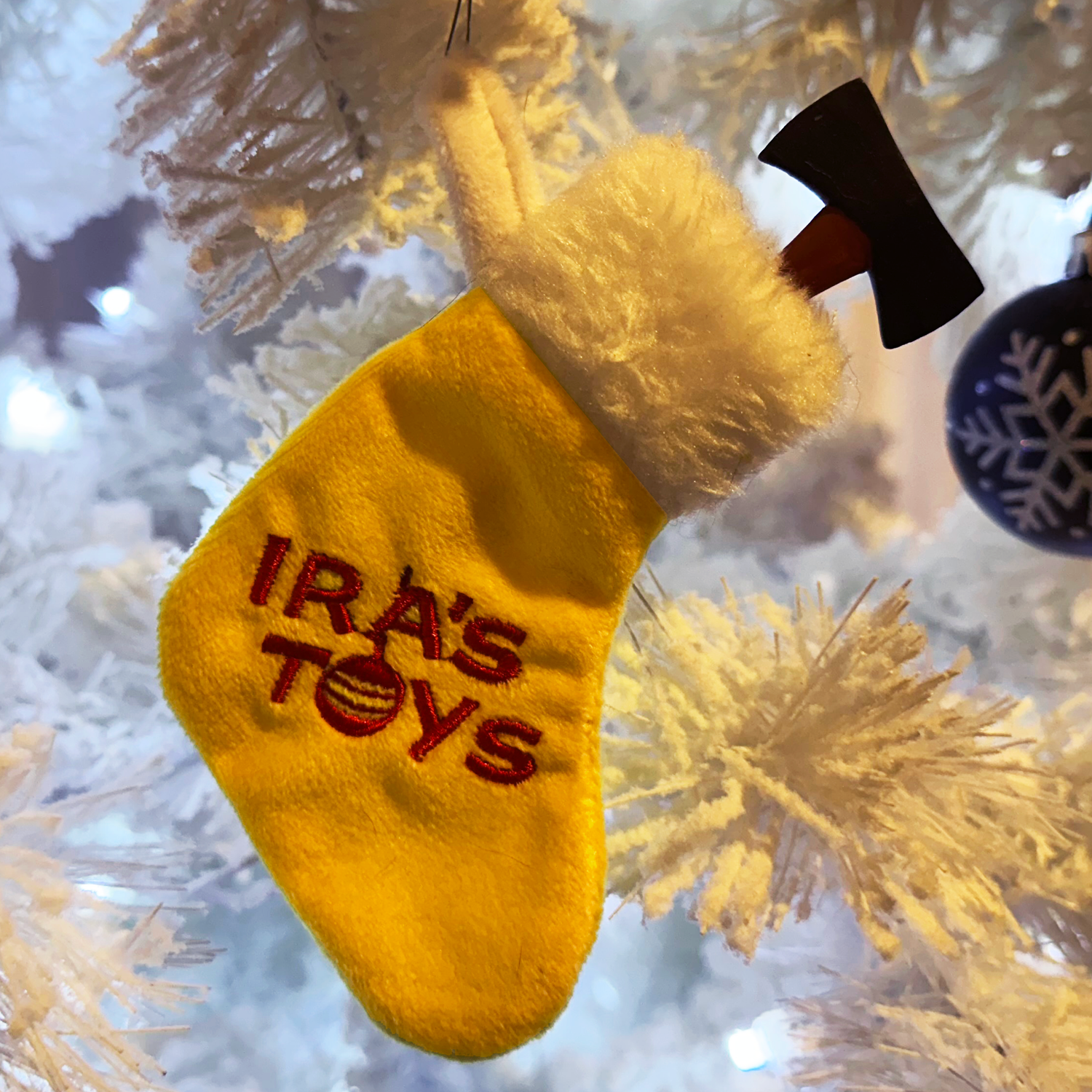 The axe was then shipped to California to be 3D scanned by one of the best scanning facilities in Los Angeles, and by using that scan our manufacturer was able to produce a 5-inch replica made of hard resin and hand-painted to look exactly like the axe used in the movie. We then had the factory create the perfect item to accompany the axe... a bright yellow and white stocking branded with a red "IRA'S TOYS" embroidered logo. This makes perfect sense because Billy takes the axe from the toy store in the movie before he goes on his killing spree!