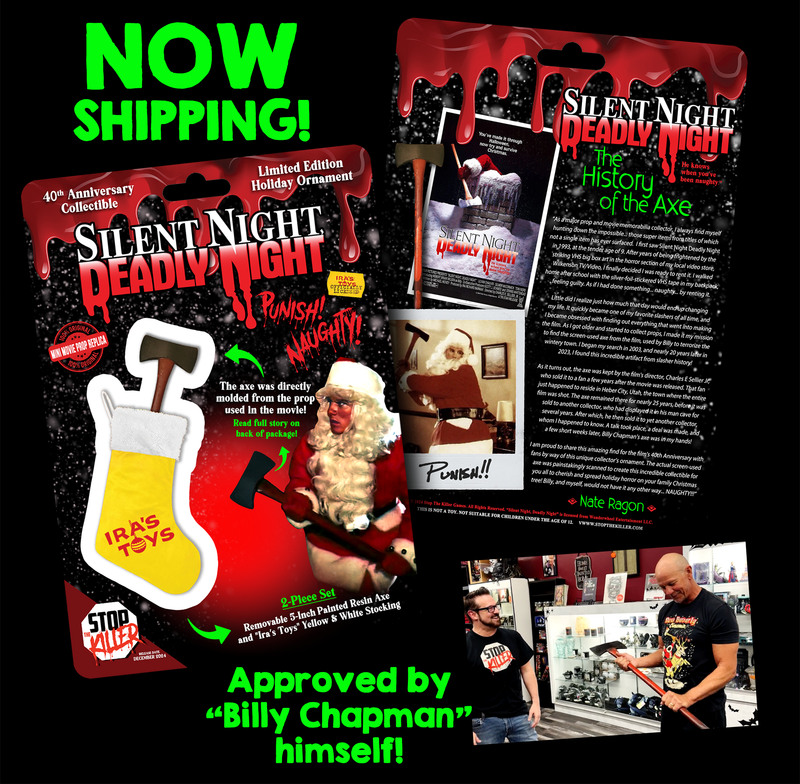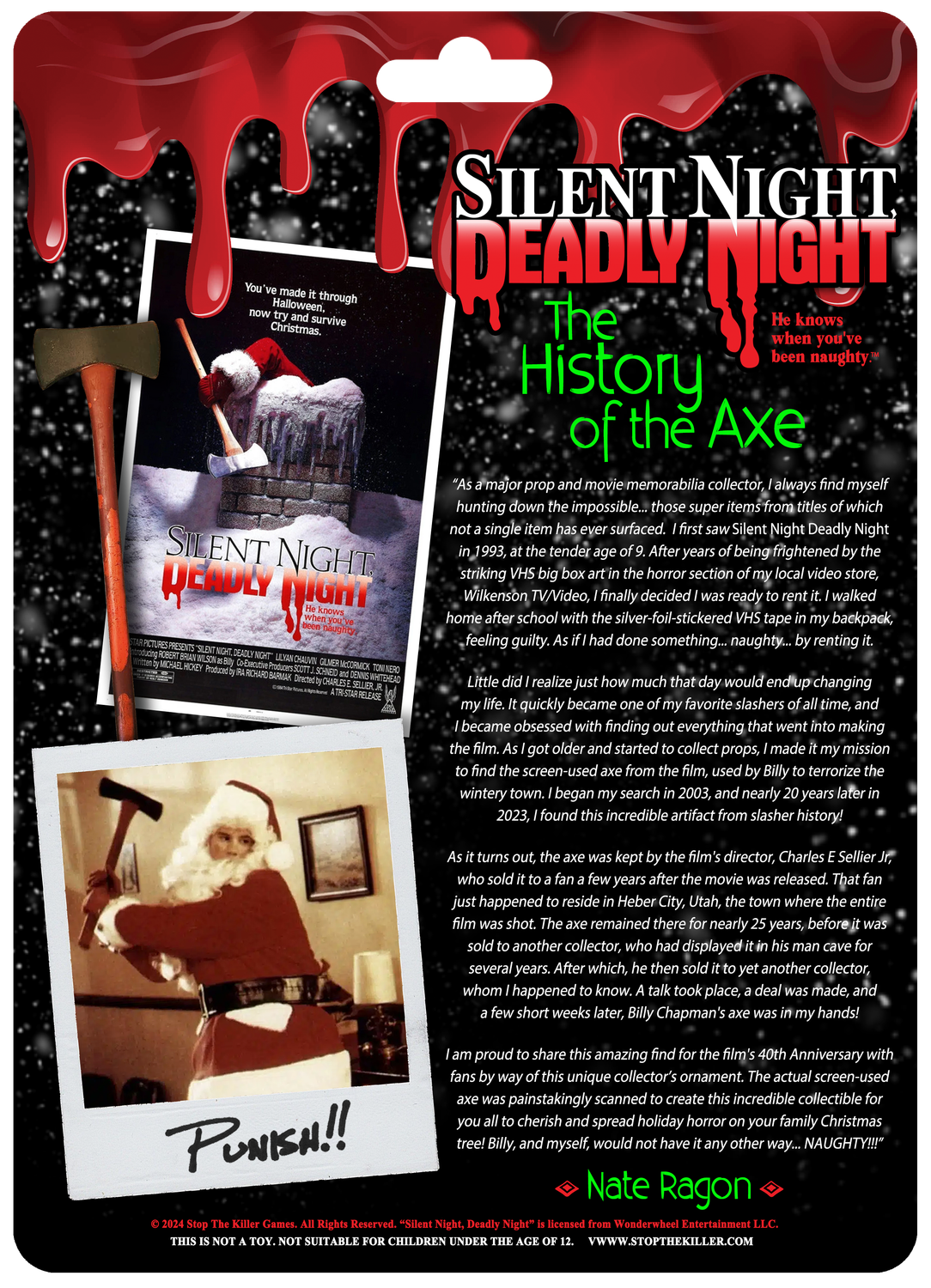 This exclusive axe and stocking ornament celebrates the 40th Anniversary of the controversial film that kicked off the Christmas slasher sub-genre wave... SILENT NIGHT, DEADLY NIGHT!