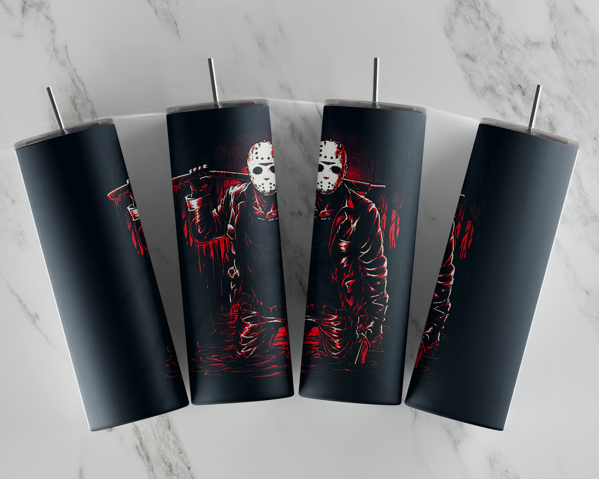 Friday the 13th Jason - 20oz tumbler. Each cup comes with a lid and straw; these are stainless steel and insulated. Each design is sublimated directly to the cup.