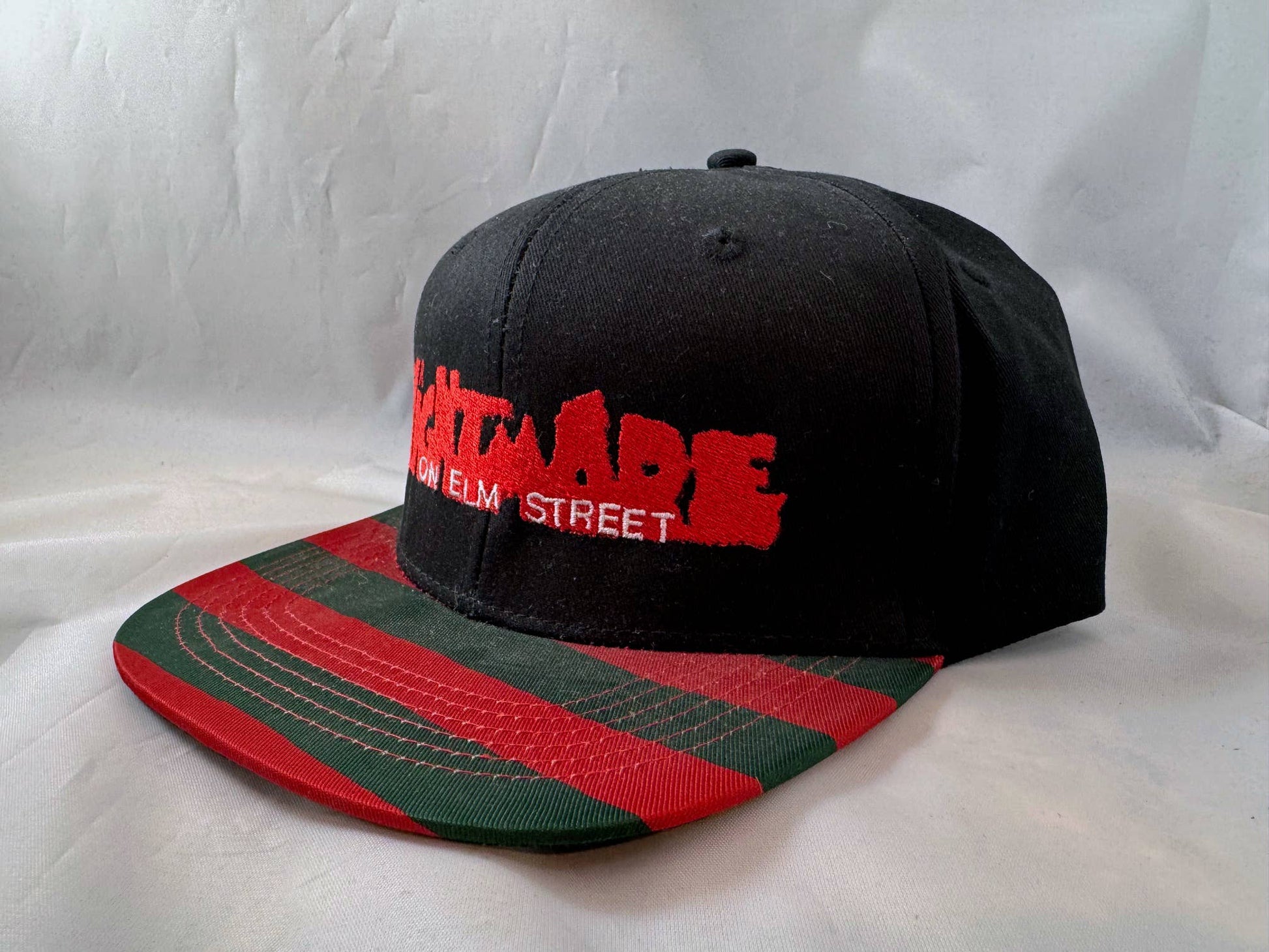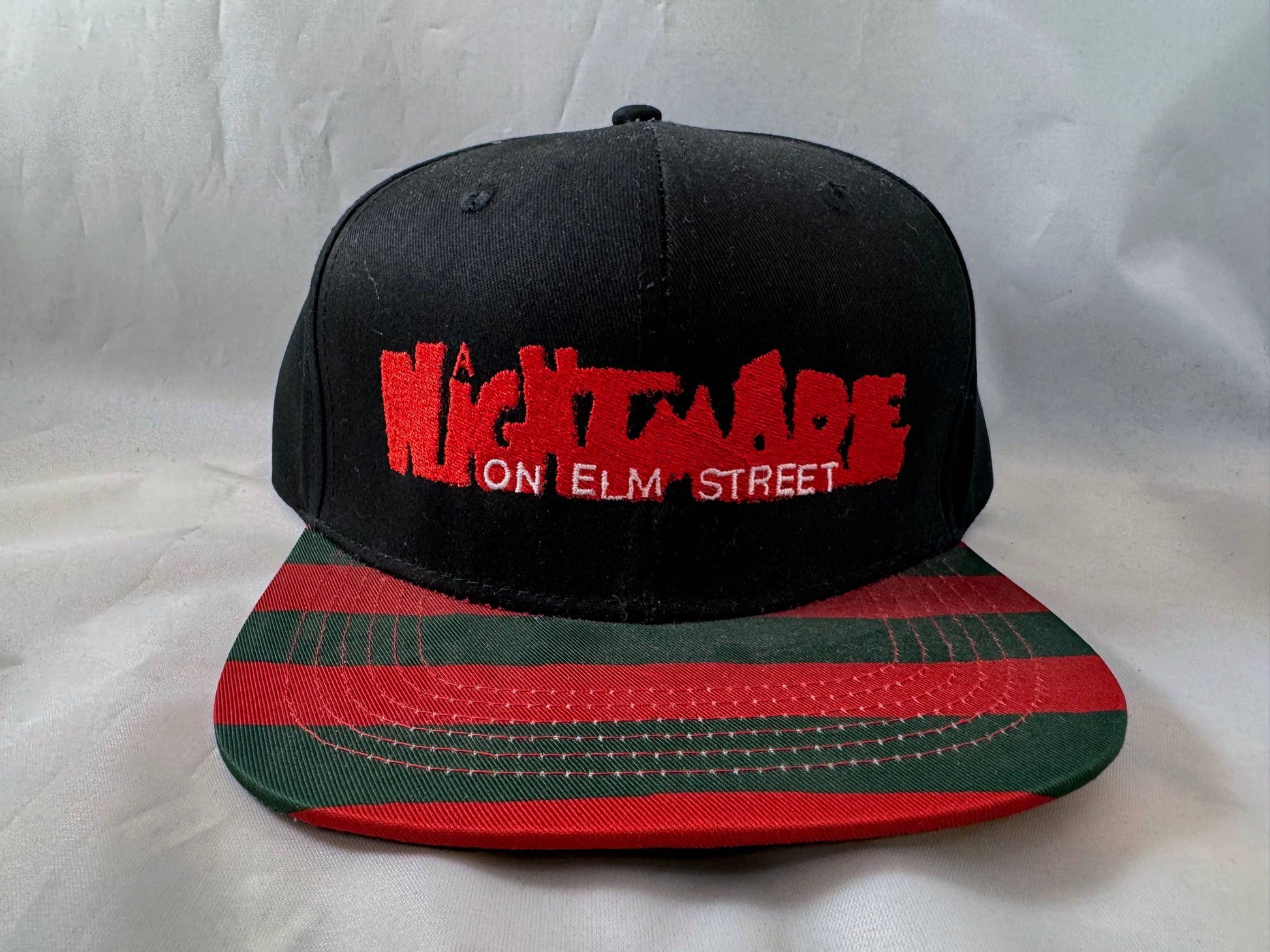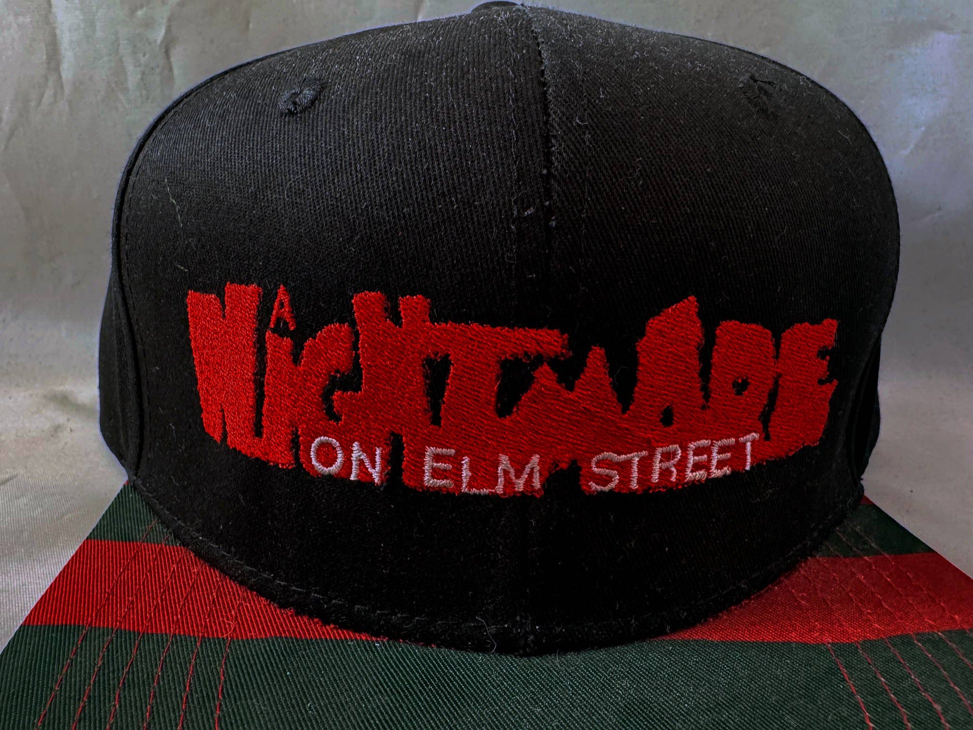 Whatever you do, don't fall asleep. Especially with your hat on! From A Nightmare on Elm Street, this 6 panel snapback baseball hat is made of 83% Acrylic / 15% Wool / 2% Spandex.