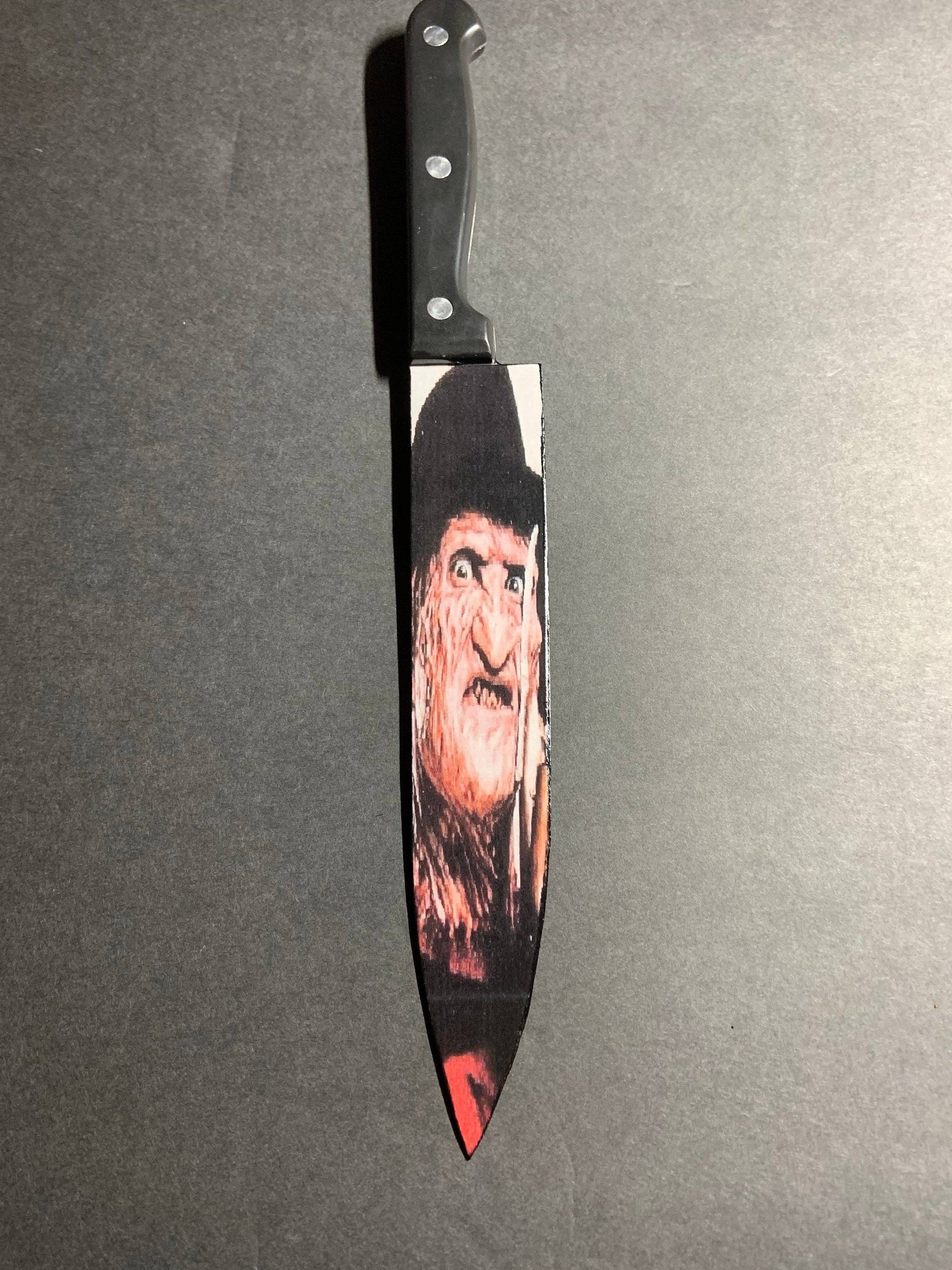 KNIFE: Freddy Krueger Nightmare on Elm St 1984 Kitchen Knife - This kitchen knife is designed after the 1984 movie A Nightmare On Elm Street. Freddy Krueger on one side and A Nightmare on Elm St title card on the other. This is a real kitchen knife. Image transferred, painted, then airbrushed a varnish clear coat.