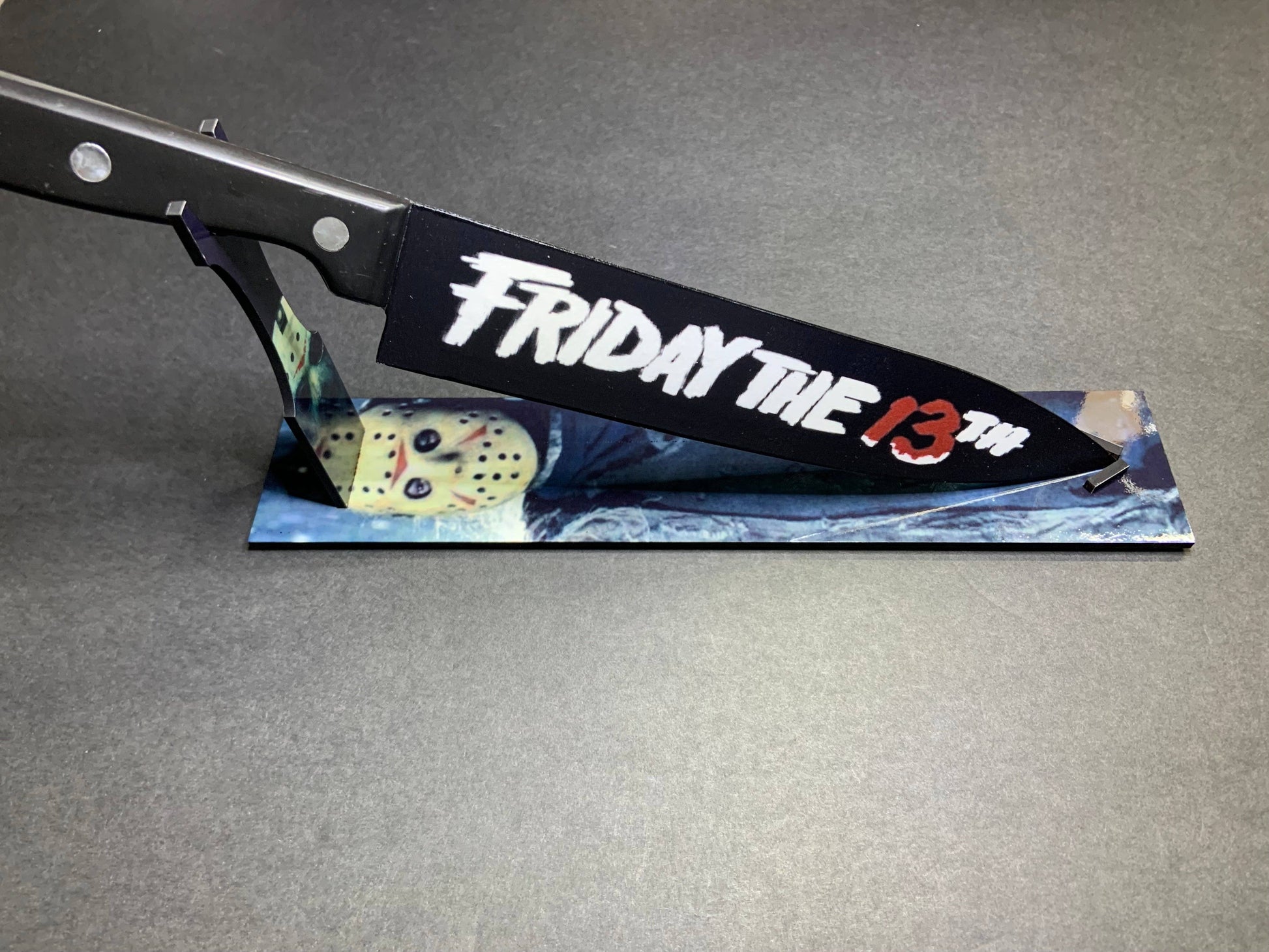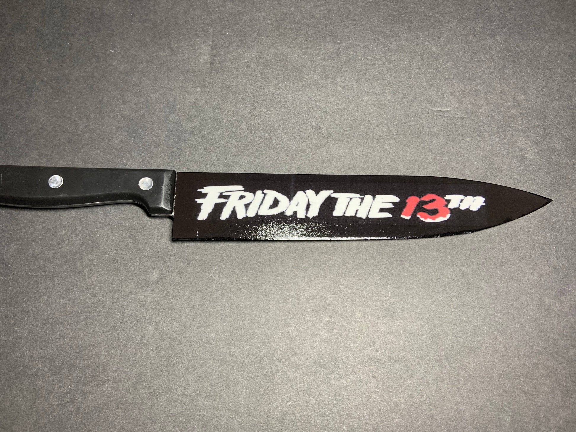 KNIFE: This kitchen knife is designed after the Friday the 13th 80's Horror Icon Jason. Jason's Hockey Mask on one side and the Friday the 13th title card on the other. This is a real kitchen knife. Image transferred, painted, then airbrushed a varnish clear coat.