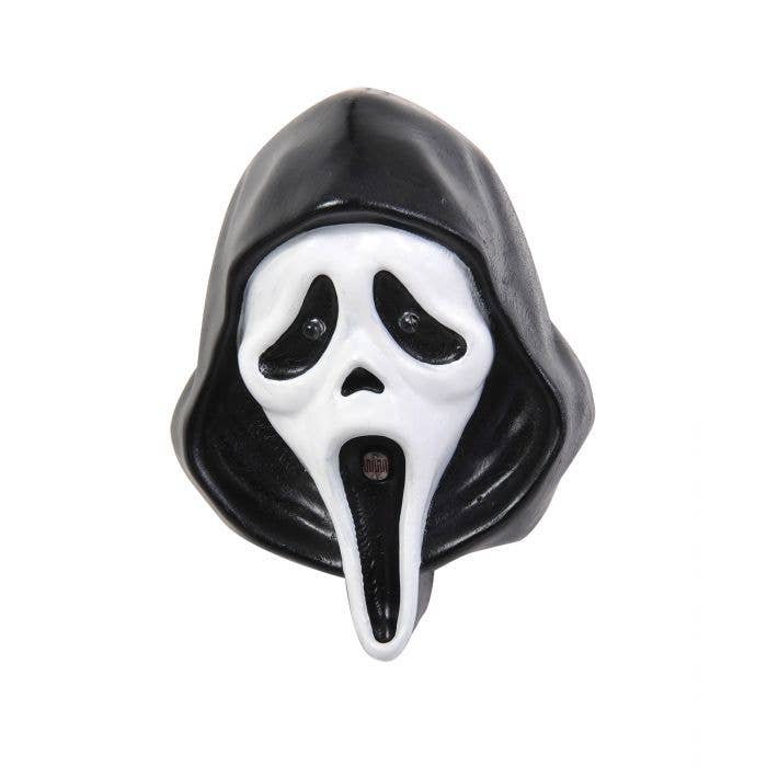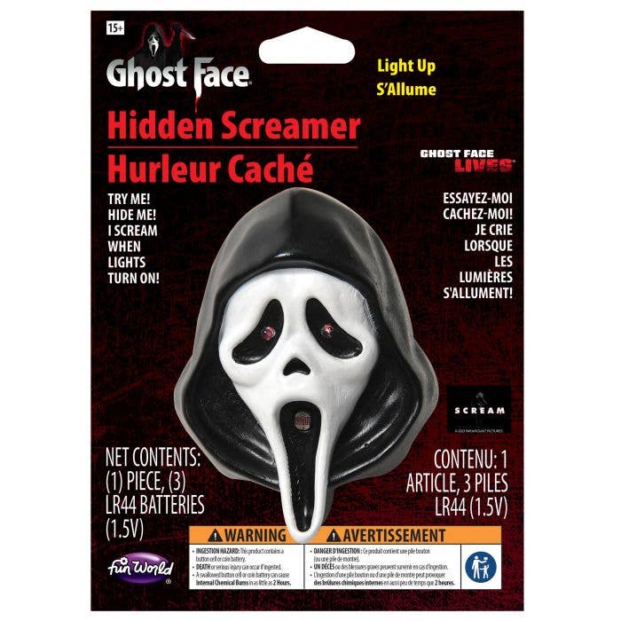 What's Included Hide in drawers, cabinets, closets, anywhere.... When exposed to light, the eyes light up and it screams! Includes 3 x LR44 (1.5V) Batteries From the movie Scream Ghostface lives