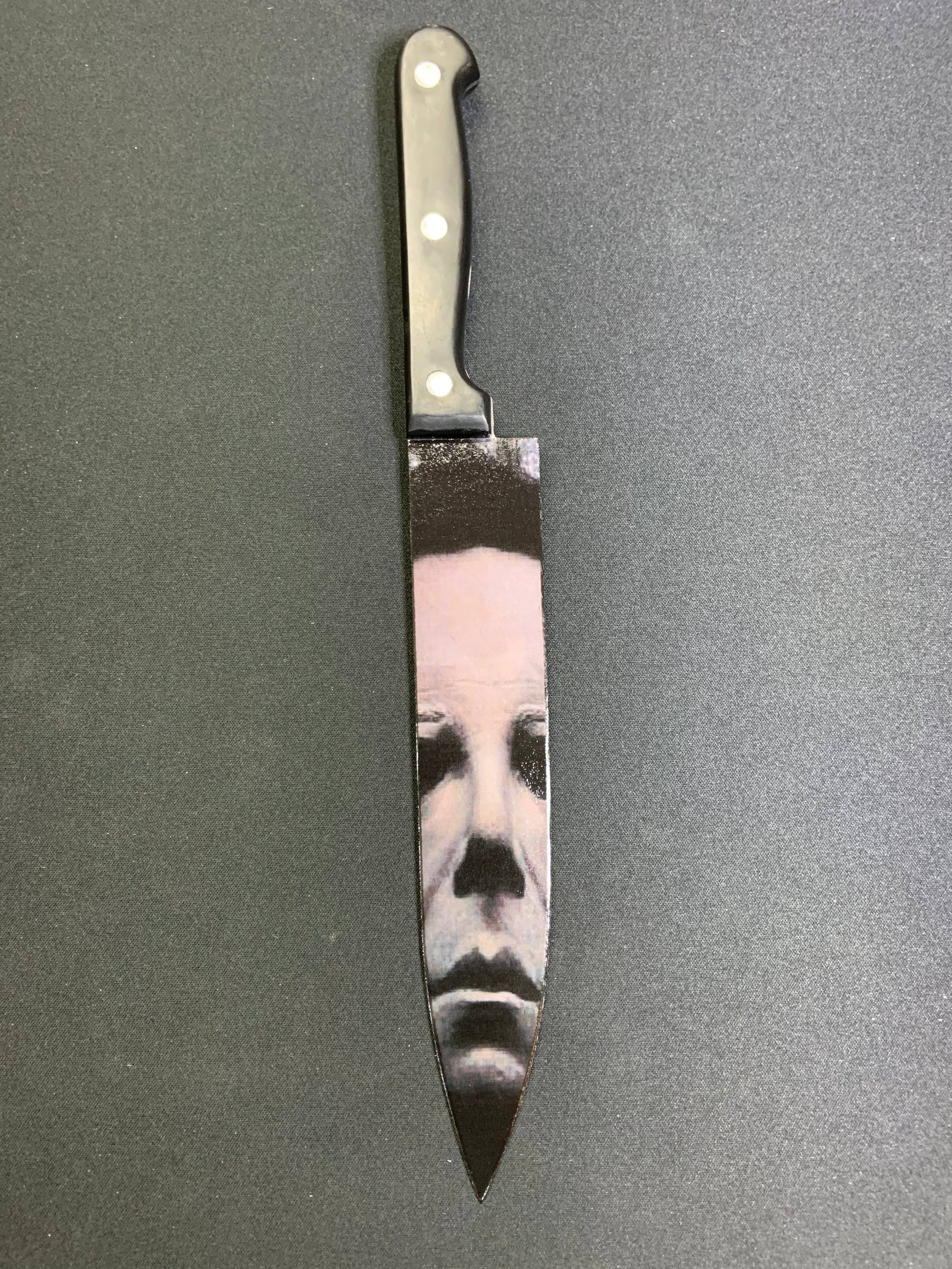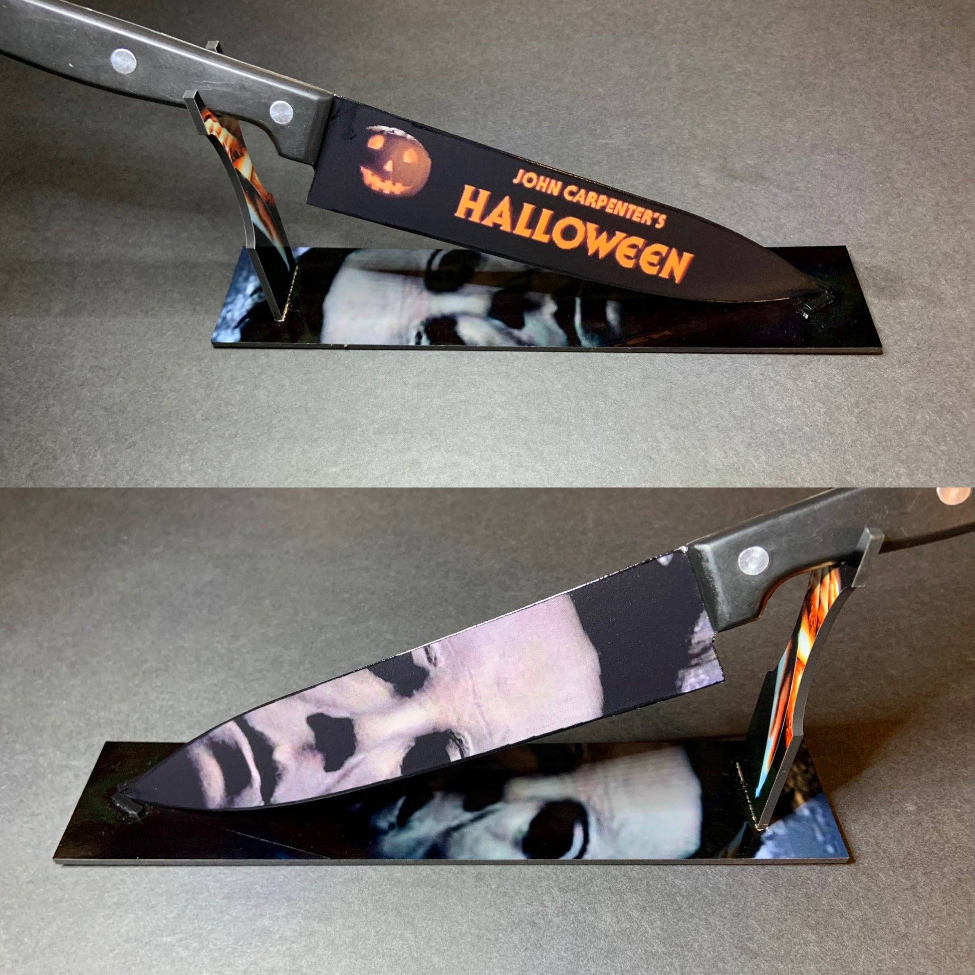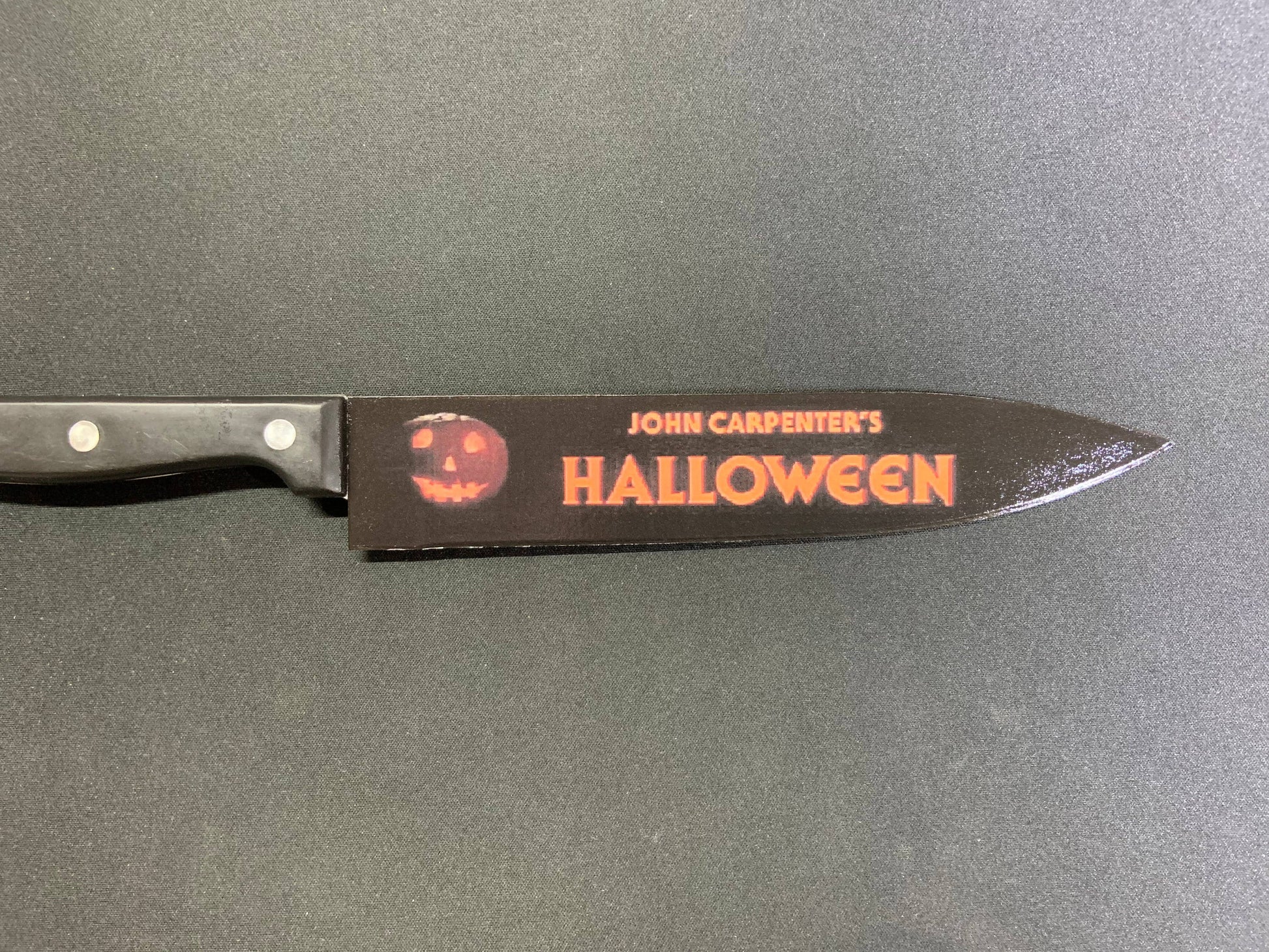 KNIFE: 1978 John Carpenter's Halloween Michael Myers Kitchen Knife This kitchen knife is designed after John Carpenter's 1978 movie Halloween. Michael Myers "The Shape" mask on one side and the John Carpenter's Halloween title card on the other. This is a real kitchen knife. Image transferred, painted, then airbrushed a varnish clear coat.