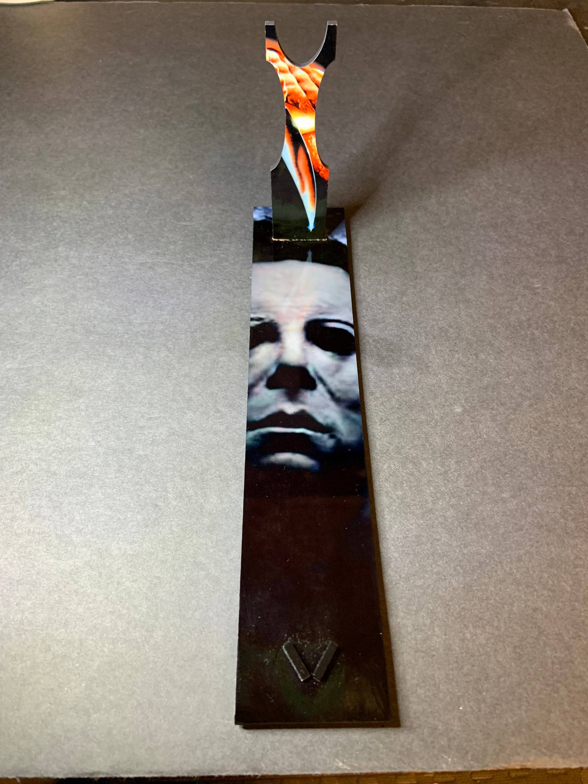 STAND- A laser cut and engraved knife stand with matching Halloween movie title engraved.