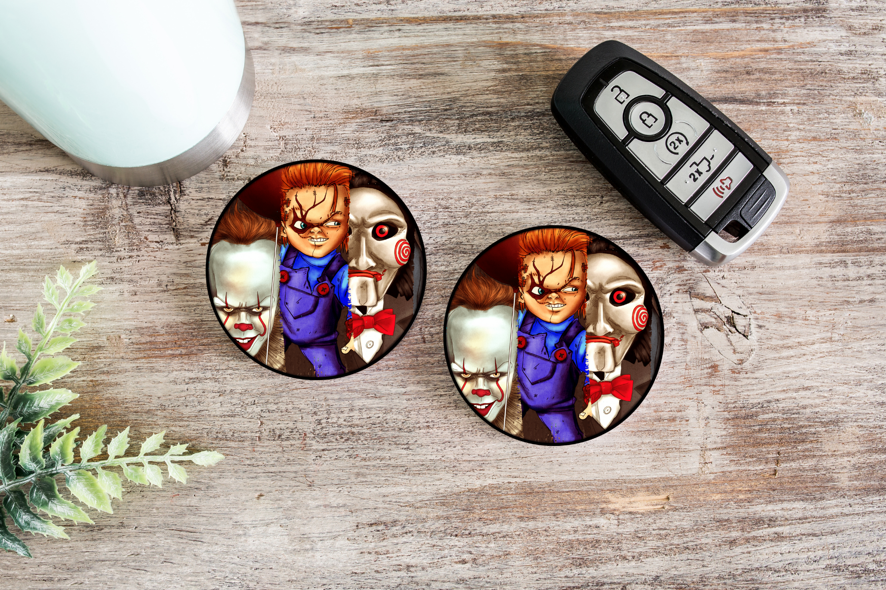 Horror Icons - Round car coaster set made from neoprene. * Fits most cup holders and absorbs drinks and spills * Two coasters included * Perfect for everyone! * 2.75" diameter