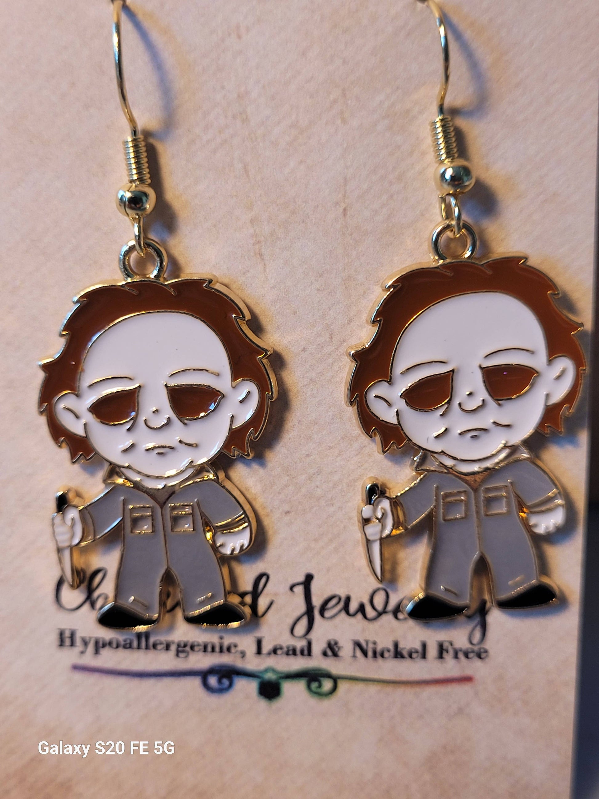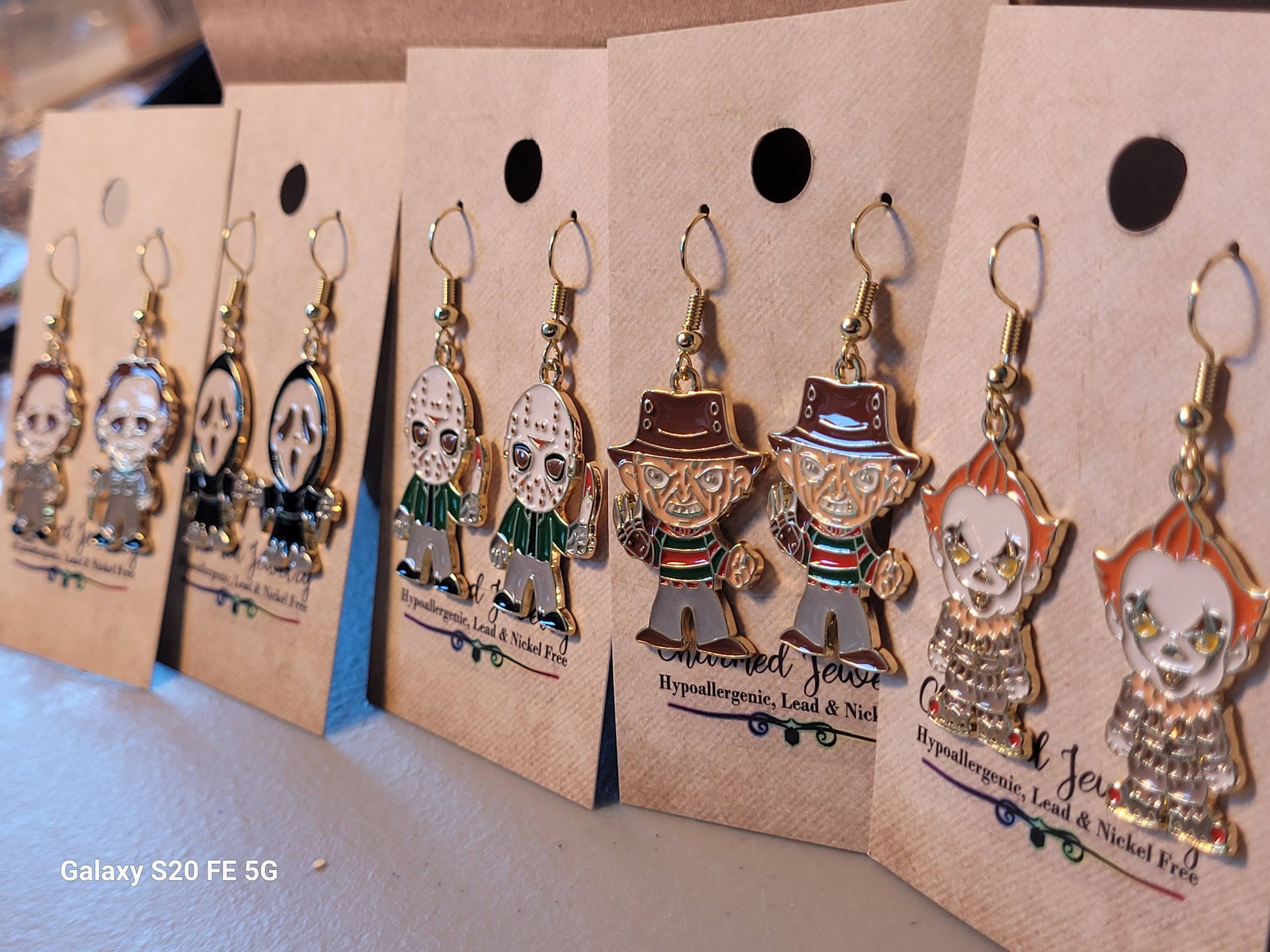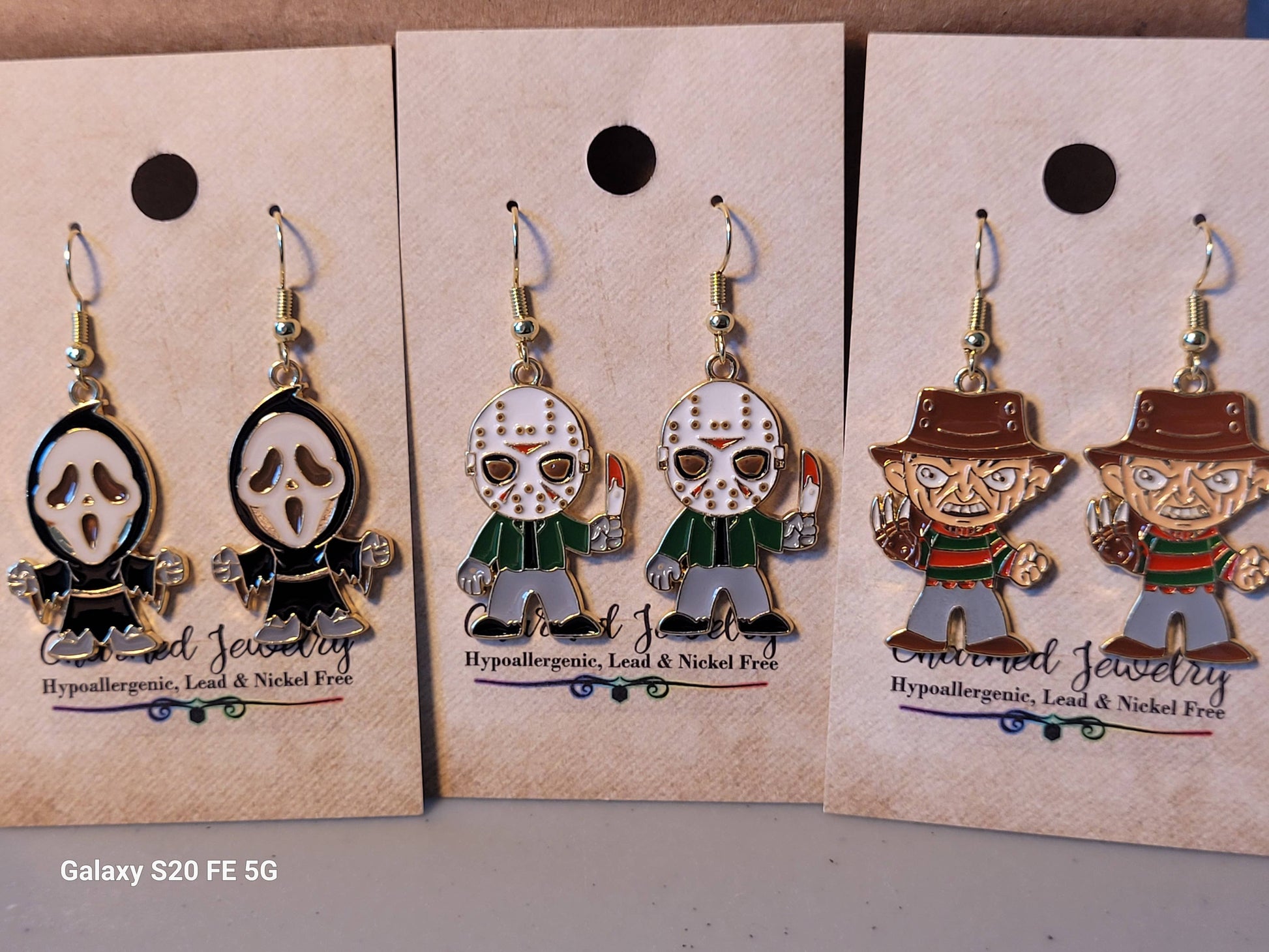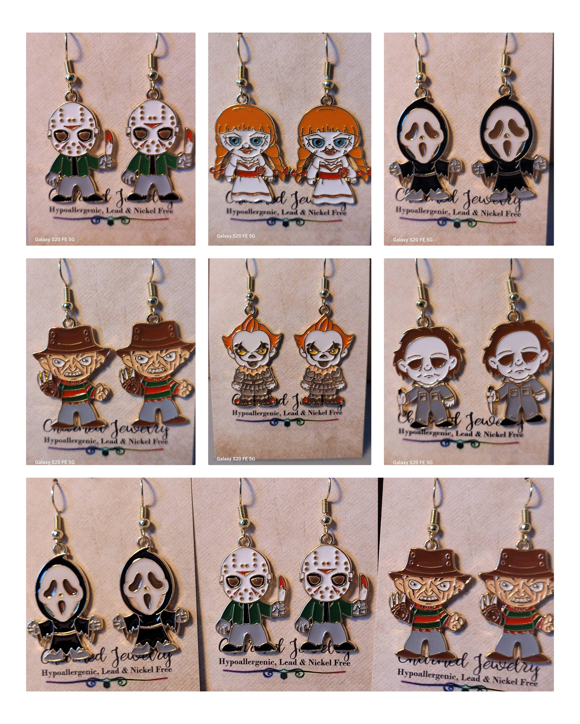 Horror Movie Character Earrings. The perfect mix of cute, spooky & scary. These chibi-styled horror character charms are the perfect spooky Halloween addition to your collection to embrace horror all year round. The earring hooks are stainless steel and silver plated and are lead and nickel free.