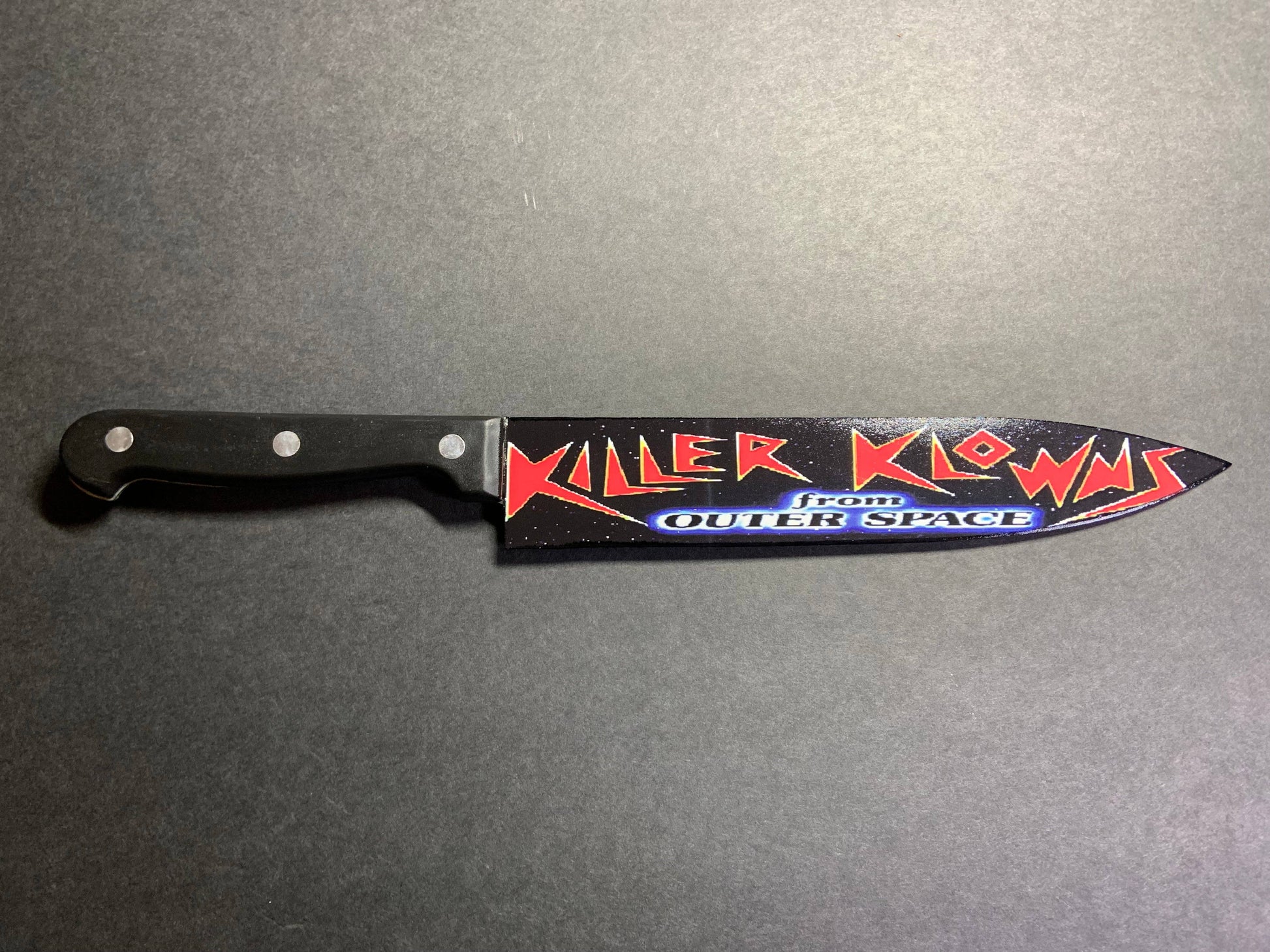 KNIFE: This kitchen knife is designed after the Killer Clowns From Outer Space movie. Clowns on one side and the Killer Clowns From Outer Space title card on the other. This is a real kitchen knife. Image transferred, painted, then airbrushed a varnish clear coat.