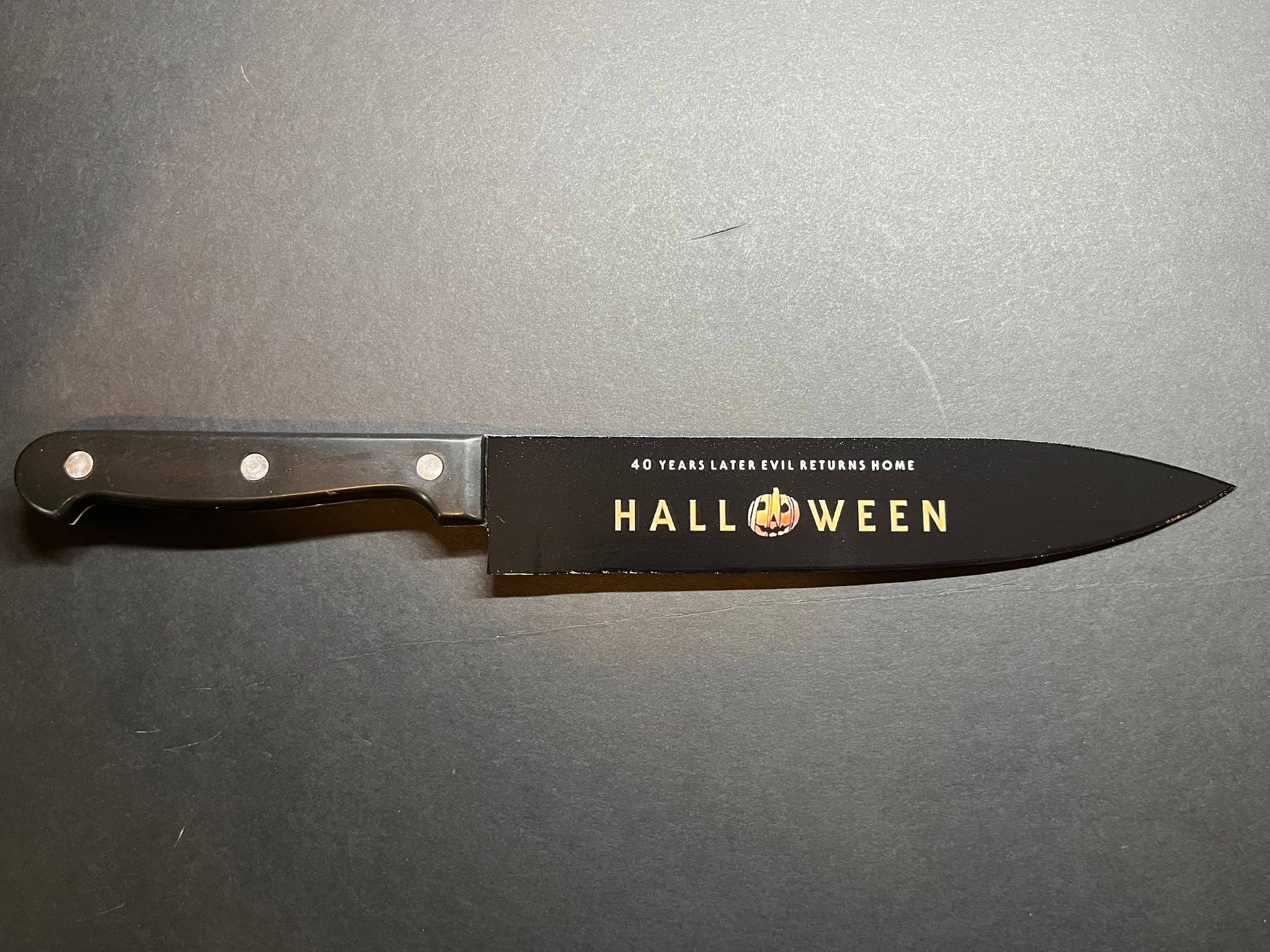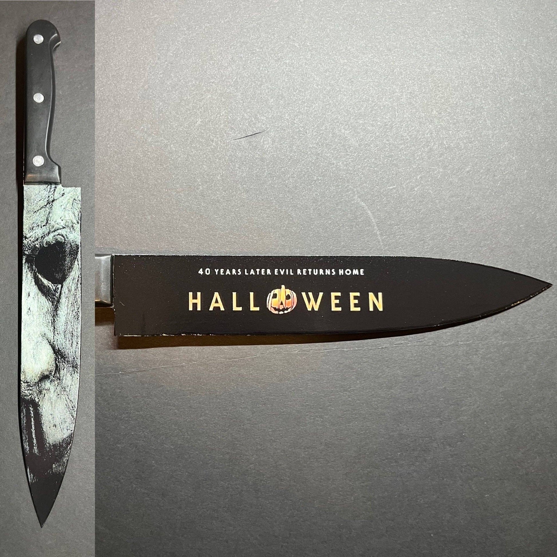 KNIFE; This kitchen knife is designed after the new Halloween 2018 movie Halloween 40 years later. Michael Myers "The Shape" mask on one side and the Halloween title card on the other. This is a real kitchen knife. Image transferred, painted, then airbrushed a varnish clear coat.