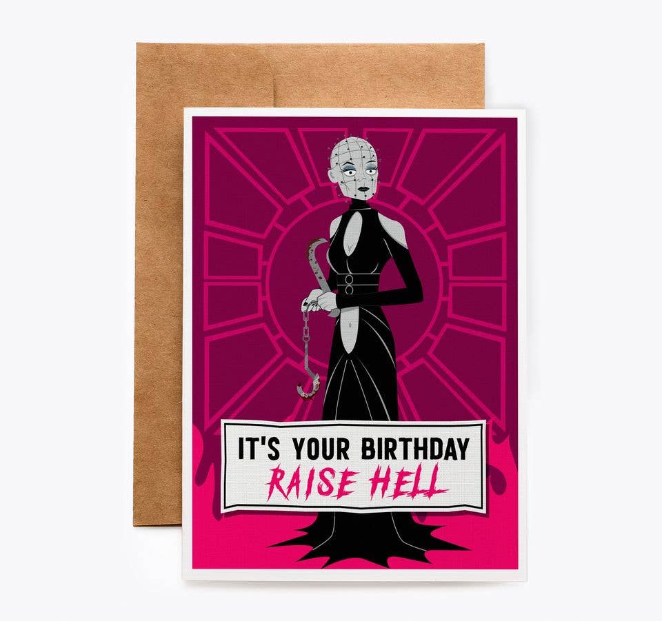 Will you accept Lady Pinhead's gift of the Lament Configuration to raise Hell on your birthday? I hope so. Blank inside. Horror movie homage card for an 80's Horror fan. 5"x7" Birthday card with 100% recycled envelope. Printed on a heavy weight matte, recycled linen card stock. Sustainably sourced.