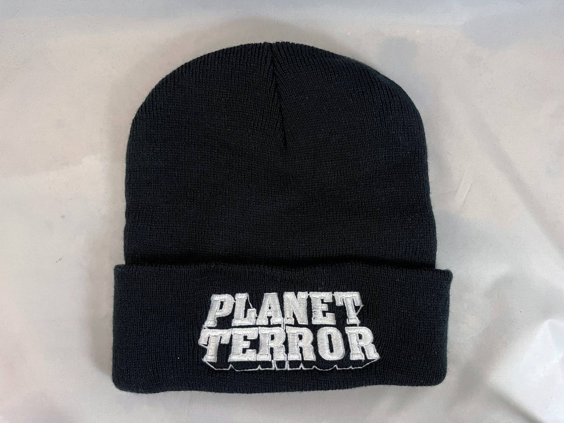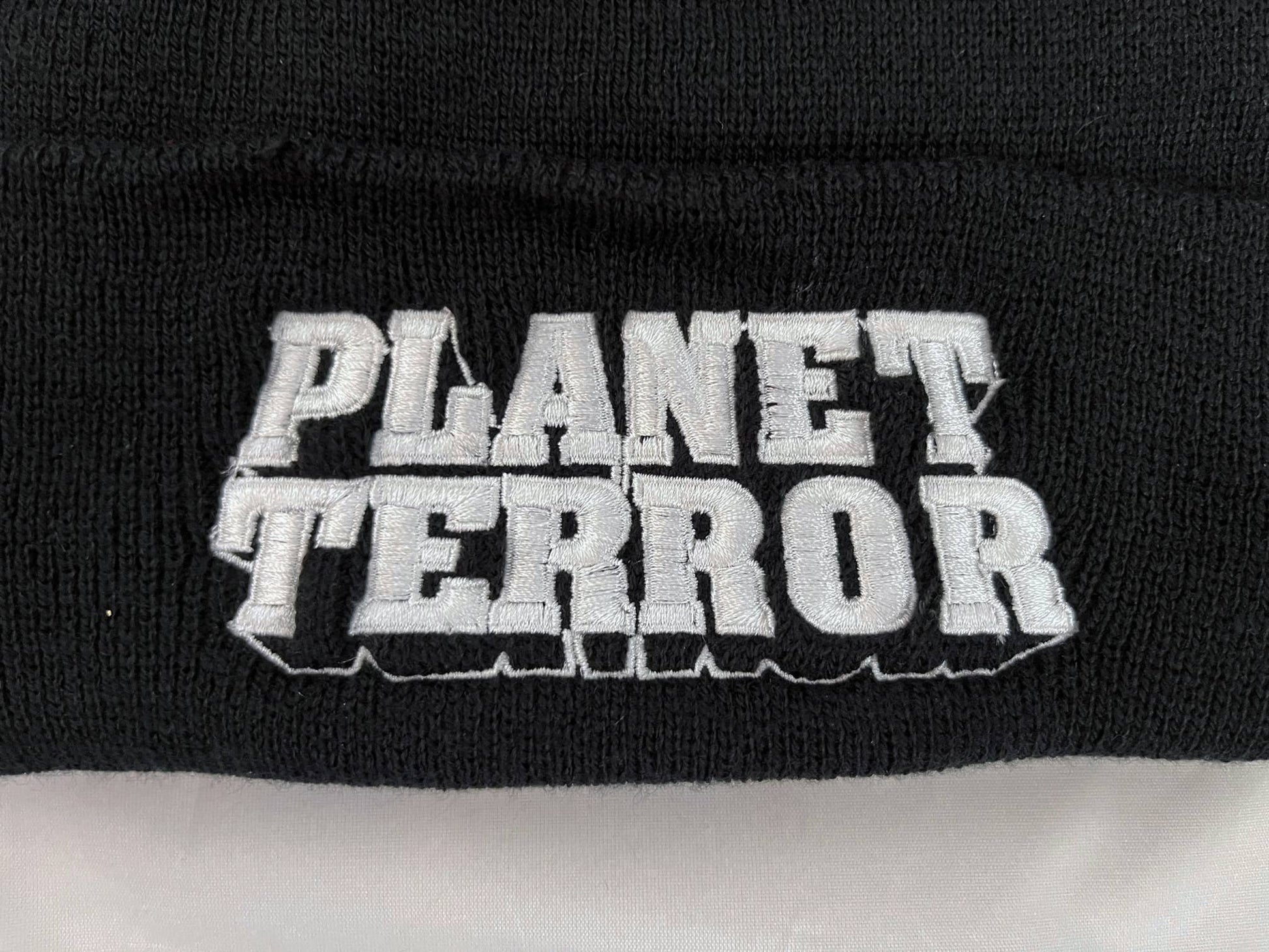 Grindhouse's "Planet Terror" embroidered fold over beanie is 100% soft-touch acrylic.