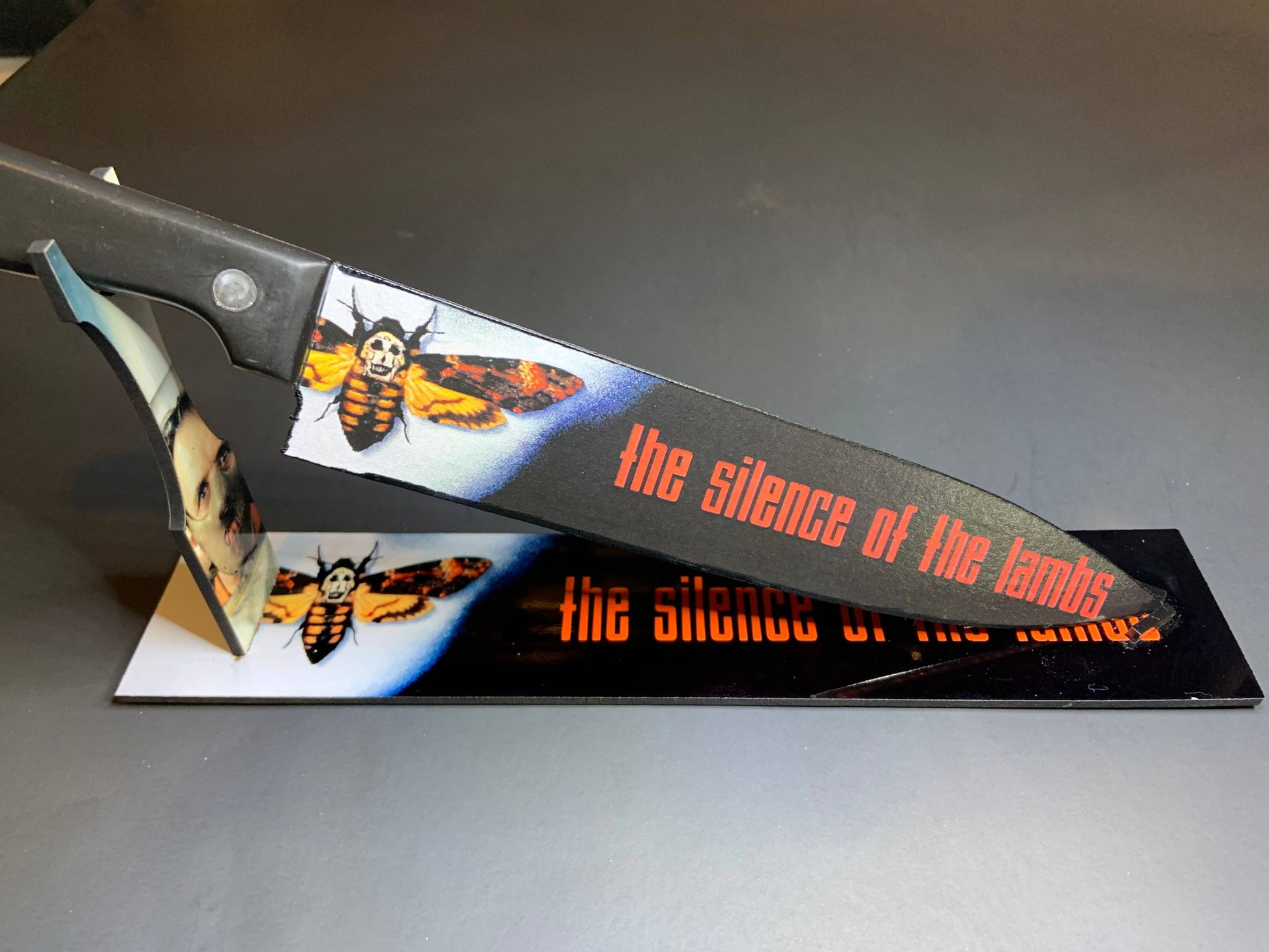 KNIFE: This kitchen knife is designed after the movie Silence Of The Lambs. Hannible on one side and the Movie title card on the other. This is a real kitchen knife. Image transferred, painted, then airbrushed a varnish clear coat,