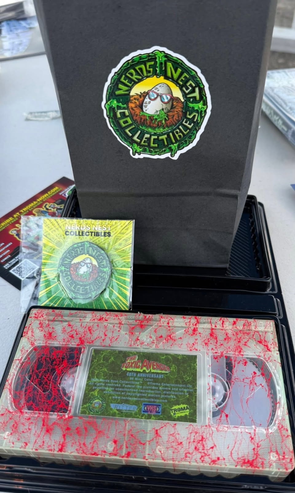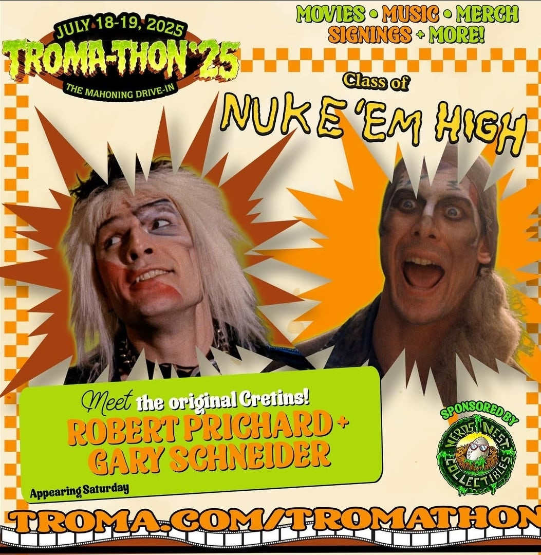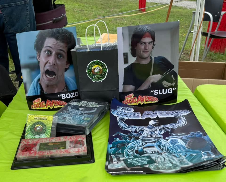 Each VHS is Autographed By Robert Prichard aka Slug and Gary Schneider aka Bozo. Set comes with a Nerds Nest Collectible pin and sticker and Toxic Avenger poster