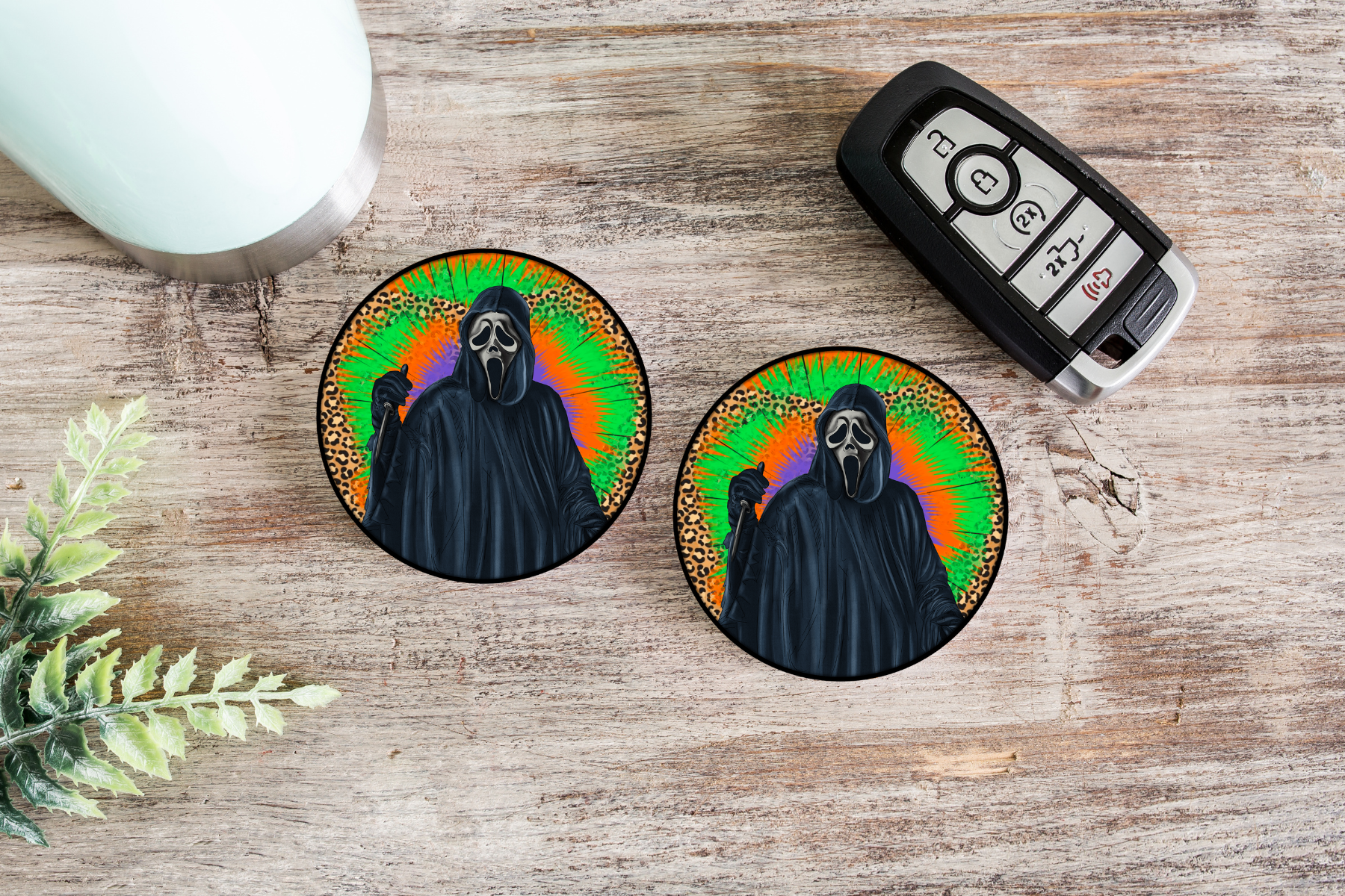 Scream Ghostface - Round car coaster set made from neoprene. * Fits most cup holders and absorbs drinks and spills * Two coasters included * Perfect for everyone! * 2.75" diameter